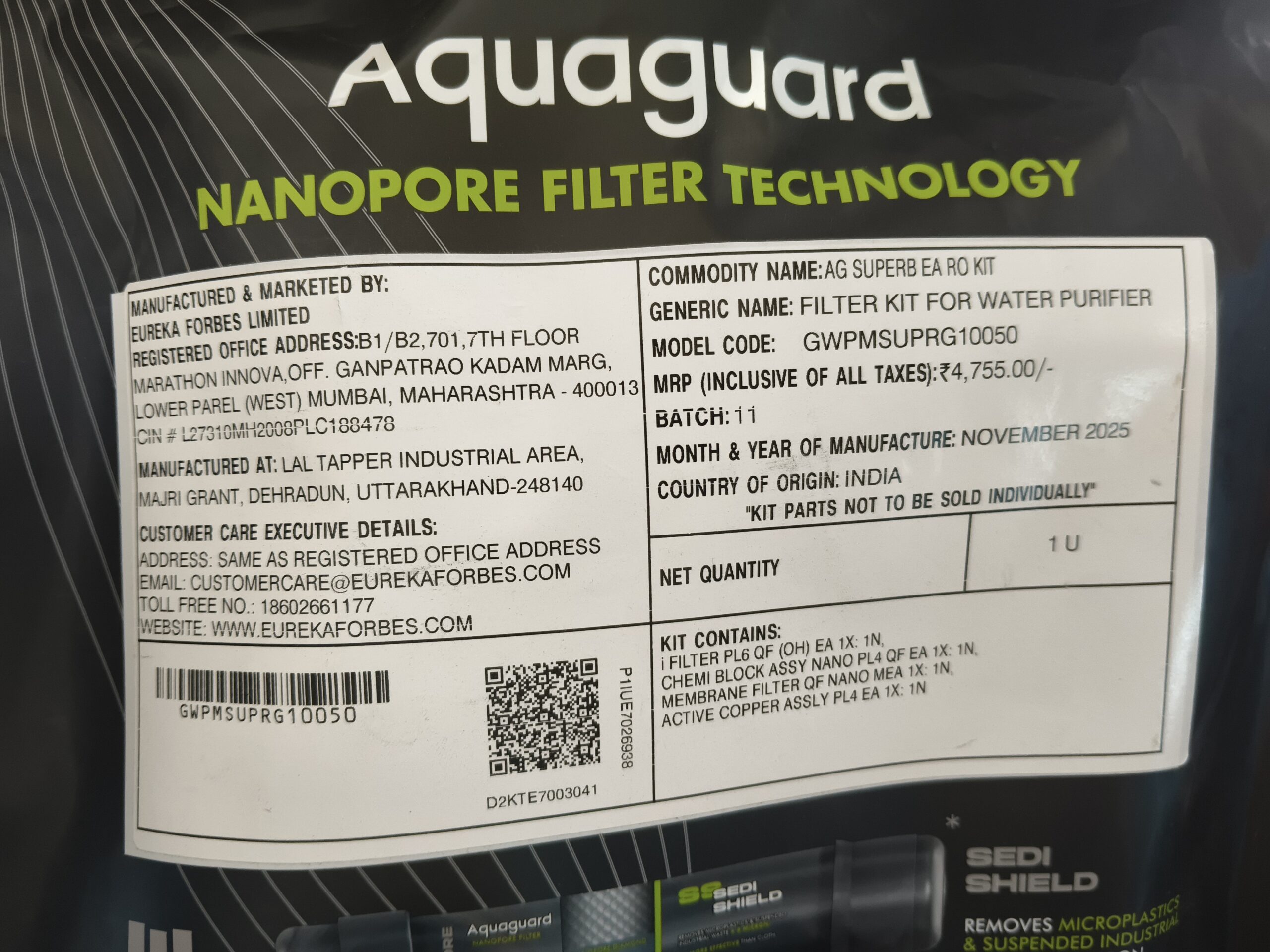 This kit contains genuine Aquaguard filters, and customers can verify authenticity by scanning the QR code printed on the packet. Once scanned, it will display the list of compatible RO models and kits, helping you confirm suitability before installation.