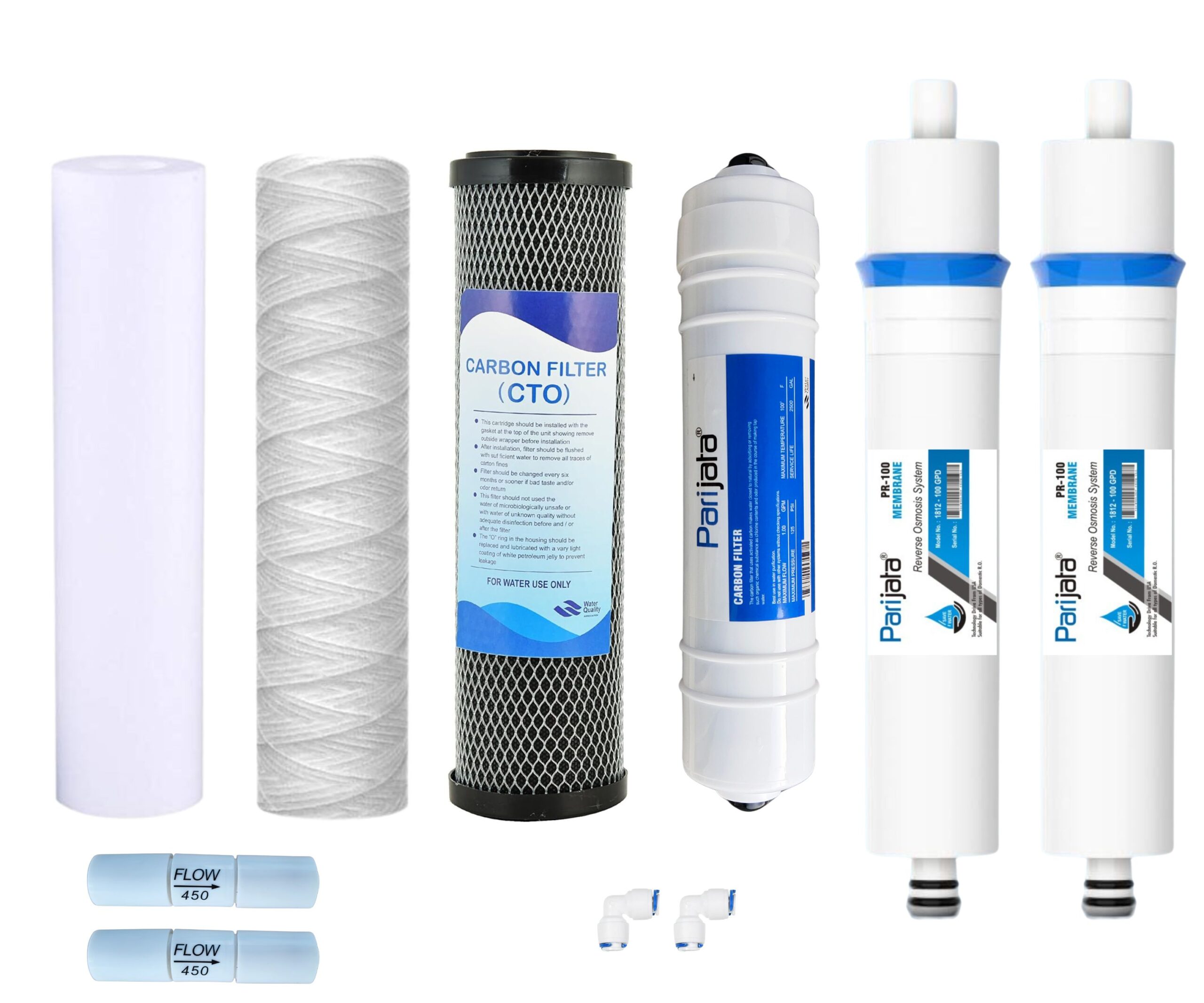It consists of PP Spun Filter, Wound Filter, Carbon Block (CTO) Filter (all 10 inch) for removing dust, sand, sediment, chlorine, odor, and organic impurities. The kit also includes 2 pieces of 100 GPD RO membranes capable of handling input water TDS up to 1500 ppm, ensuring high water recovery and consistent purification.